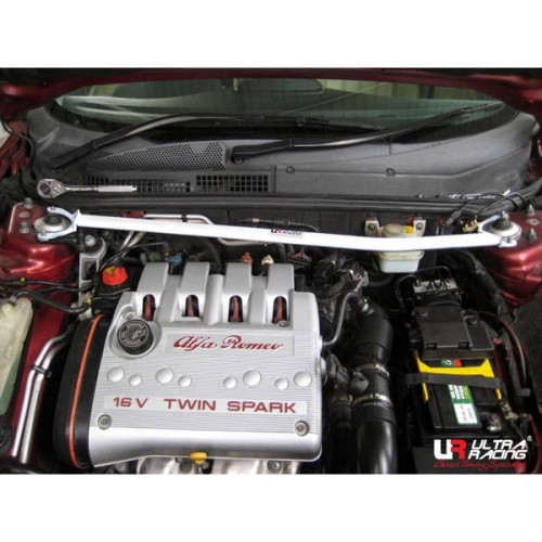 Передняя распорка стоек Alfa Romeo 147 усиливает жесткость шасси автомобиля, уменьшает крен в поворотах и нейтрализует удар при одновременном попадании передних колес в яму или наезде на кочку.