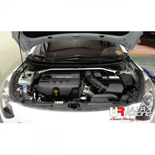 Передняя распорка стоек Hyundai I 30 (GD) 1.6 (2012) усиливает жесткость шасси автомобиля, уменьшает крен в поворотах и нейтрализует удар при одновременном попадании передних колес в яму или наезде на кочку.